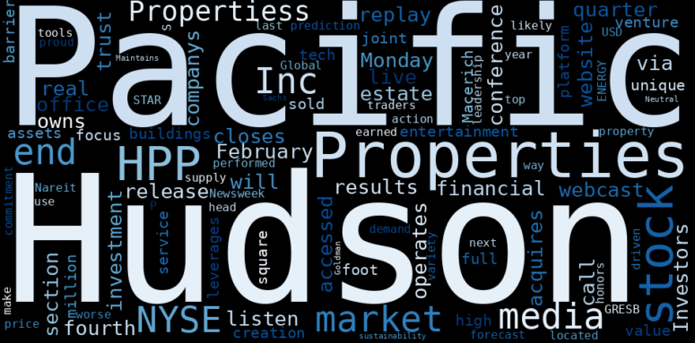 How much time have you spent trying to decide whether investing in Hudson Pacific Properties? Many investors start with the dream of being free. They expect to find on the stock market an option to have time to develop their own interests and hobbies. That is, a way to escape a 9 to 5 job. However, investment is complex and investors end up spending whole days (and nights) trying to figure out which the right stock to invest is. The dream of stock investing becomes the nightmare of facing infinity amounts of information. As a solution, we programmed an artificial intelligence that reads the whole internet and the uses natural language processing and vectorizers to summarize the information. Usually, the AI reads several hundred pages and summarize it to a short document. This document presents our results. We found that the most common words in the internet about Hudson Pacific …