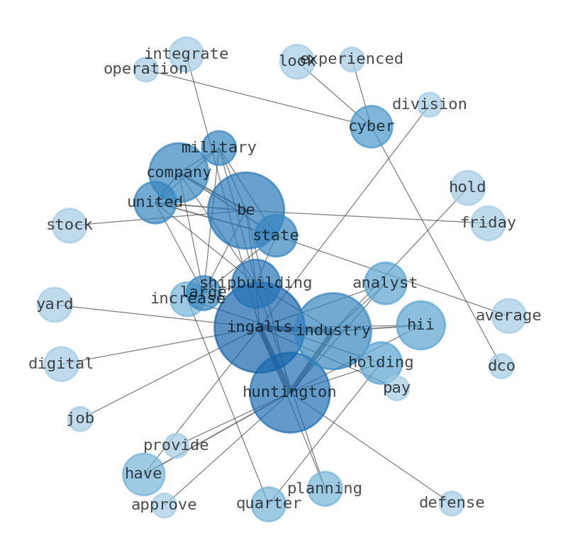 The game is changing. There is a new strategy to evaluate Huntington Ingalls Industries fundamental value, possible risks and most salient advantages. Investors have traditionally relied in reading large amounts of text to evaluate the fundamental value of a stock or company. However, the development of Artificial Intelligence (AI) tools is modifying the way investments are evaluated in markets. Today, machine learning, natural language processing and bigdata allow making this process automatic, reducing large amounts of text to the elements that have a higher activation in a neural network. We programmed an artificial intelligence that reads the whole internet and the uses natural language processing and vectorizers to summarize the information. Usually, the AI reads several hundred pages and summarize it to a short document. This document presents our results. We found that the most common words in the internet about Huntington Ingalls Industries are: Ingalls, Huntington, Industries, company, HII, …