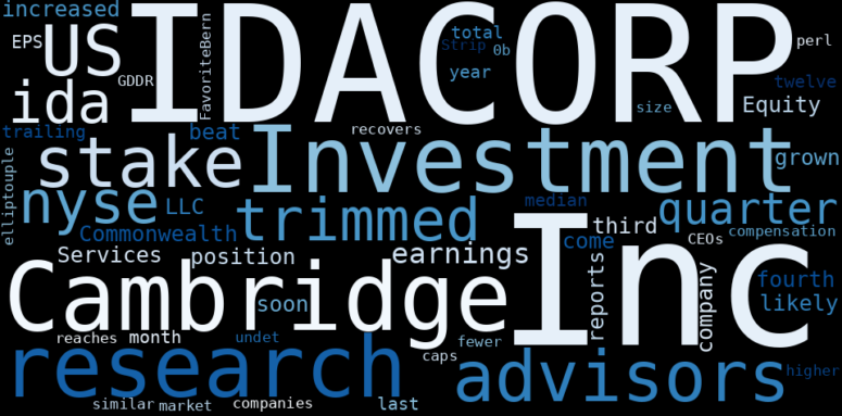 How much time have you spent trying to decide whether investing in IDACORP? Many investors start with the dream of being free. They expect to find on the stock market an option to have time to develop their own interests and hobbies. That is, a way to escape a 9 to 5 job. However, investment is complex and investors end up spending whole days (and nights) trying to figure out which the right stock to invest is. The dream of stock investing becomes the nightmare of facing infinity amounts of information. As a solution, we programmed an artificial intelligence that reads the whole internet and the uses natural language processing and vectorizers to summarize the information. Usually, the AI reads several hundred pages and summarize it to a short document. This document presents our results. We found that the most common words in the internet about IDACORP are: Cambridge, Inc, …