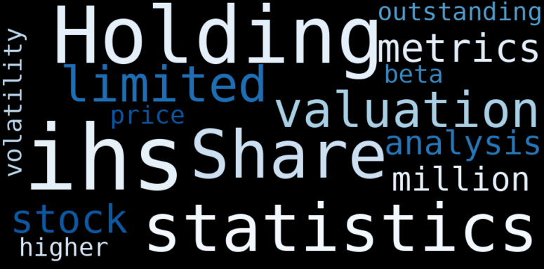 How much time have you spent trying to decide whether investing in IHS Holding? Many investors start with the dream of being free. They expect to find on the stock market an option to have time to develop their own interests and hobbies. That is, a way to escape a 9 to 5 job. However, investment is complex and investors end up spending whole days (and nights) trying to figure out which the right stock to invest is. The dream of stock investing becomes the nightmare of facing infinity amounts of information. As a solution, we programmed an artificial intelligence that reads the whole internet and the uses natural language processing and vectorizers to summarize the information. Usually, the AI reads several hundred pages and summarize it to a short document. This document presents our results. We found that the most common words in the internet about IHS Holding are: ihs, IHS, hold, limited, statistic, valuation, metric, and the most common words in the summary are: ihs, stock, hold, service, forecast, news, bloomberg, . One of the sentences in the summary was: The beta is 1.30, so IHS Holdings price volatility has been higher.. Other searches related to this term that the AI found were: stockmarketlive, livestock, stockmarketforbeginners, thestockmarket, stockmarkettoday, stockmarkettrading, stockmarketstocks, todaystockmarket, thestockmarket, marketnews, stockmarketnews, whatisstockmarket, usstockmarket, stockmarketopen. #ihs #stock #hold #service #forecast #news #bloomberg.