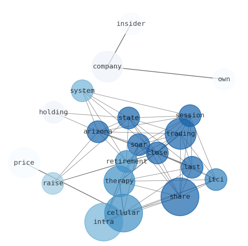 This document will help you to evaluate Intra-Cellular Therapies without reading an infinite amount of sources. Relying only on stock quotes or prices to make investment decisions is a mistake. Analyzing and observing stock charts, highs and lows and other numerical data does not allow to evaluate the real value of a company. Stock quotes and prices are the result of underlying characteristics of a company and of events and news happening around them. For this reason, investing must be based on information, not numbers. As a solution, we programmed an artificial intelligence that reads the whole internet and the uses natural language processing and vectorizers to summarize the information. Usually, the AI reads several hundred pages and summarize it to a short document. This document presents our results. We found that the most common words in the internet about Intra-Cellular Therapies are: IntraCellular, share, Therapies, ITCI, soar, last, trading, …