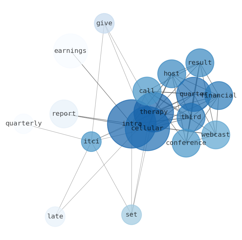 This document will help you to evaluate Intra-Cellular Therapies without reading an infinite amount of sources. Relying only on stock quotes or prices to make investment decisions is a mistake. Analyzing and observing stock charts, highs and lows and other numerical data does not allow to evaluate the real value of a company. Stock quotes and prices are the result of underlying characteristics of a company and of events and news happening around them. For this reason, investing must be based on information, not numbers. As a solution, we programmed an artificial intelligence that reads the whole internet and the uses natural language processing and vectorizers to summarize the information. Usually, the AI reads several hundred pages and summarize it to a short document. This document presents our results. We found that the most common words in the internet about Intra-Cellular Therapies are: IntraCellular, earnings, quarter, Therapies, report, host, third, …