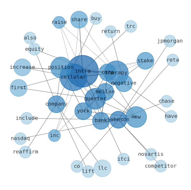 Are looking for the most relevant information about Intra-Cellular Therapies? Investor spend a lot of time searching for information to make investment decisions in Intra-Cellular Therapies. This task is often burdensome and consumes huge amounts of free time. It also leads to mistakes due to fatigue and bounded rationality. As a solution, we programmed an artificial intelligence that reads the whole internet and the uses natural language processing and vectorizers to summarize the information. Usually, the AI reads several hundred pages and summarize it to a short document. This document presents our results. We found that the most common words in the internet about Intra-Cellular Therapies are: IntraCellular, Therapies, Intra, quarter, position, stake, share, and the most common words in the summary are: therapy, intracellular, stock, cell, company, share, inc, . One of the sentences in the summary was: raised its stake in shares of Intra Cellular Therapsies by 11.7% in the 1st quarter. Other searches related to this term that the AI found were: stockmarketlive, livestock, stockmarketforbeginners, thestockmarket, stockmarkettoday, stockmarkettrading, stockmarketstocks, todaystockmarket, thestockmarket, marketnews, stockmarketnews, whatisstockmarket, usstockmarket, stockmarketopen. #therapy #intracellular #stock #cell #company #share #inc.