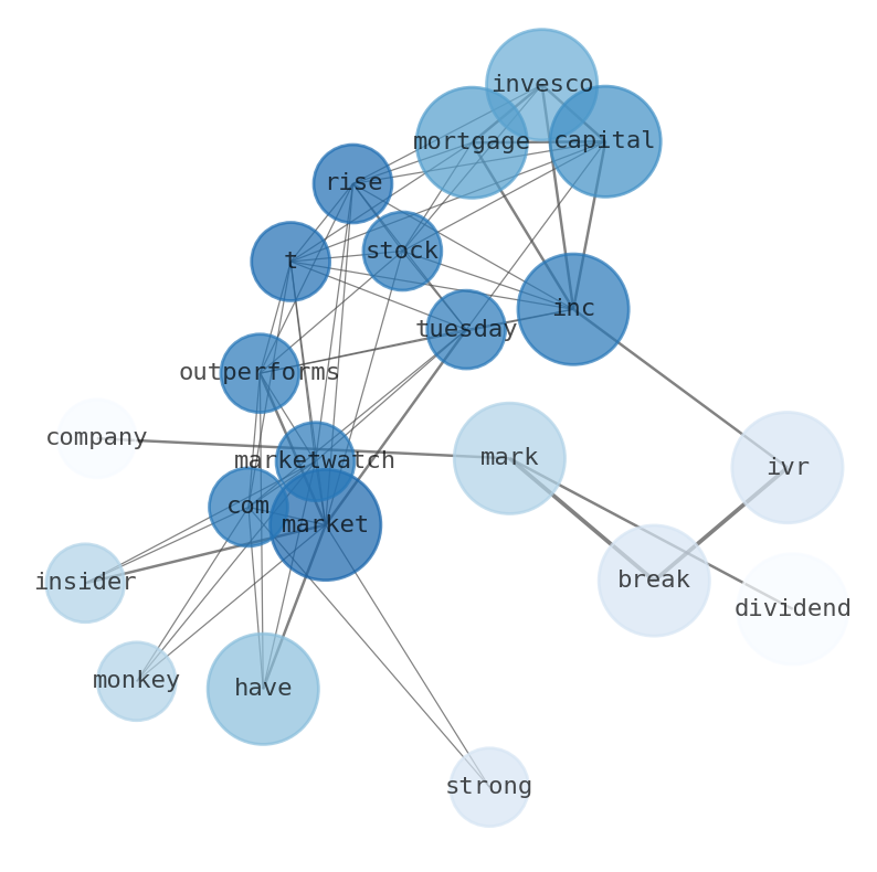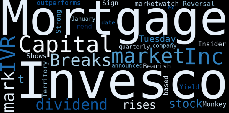 This document will help you to evaluate Invesco Mortgage Capital without reading an infinite amount of sources. Relying only on stock quotes or prices to make investment decisions is a mistake. Analyzing and observing stock charts, highs and lows and other numerical data does not allow to evaluate the real value of a company. Stock quotes and prices are the result of underlying characteristics of a company and of events and news happening around them. For this reason, investing must be based on information, not numbers. As a solution, we programmed an artificial intelligence that reads the whole internet and the uses natural language processing and vectorizers to summarize the information. Usually, the AI reads several hundred pages and summarize it to a short document. This document presents our results. We found that the most common words in the internet about Invesco Mortgage Capital are: Invesco, Mortgage, Capital, Inc, market, IVR, Breaks, and the most common words in the summary are: invesco, best, mortgage, dividend, stock, capital, score, . One of the sentences in the summary was: Invesco Mortgage Capital Inc. Other searches related to this term that the AI found were: stockmarketlive, livestock, stockmarketforbeginners, thestockmarket, stockmarkettoday, stockmarkettrading, stockmarketstocks, todaystockmarket, thestockmarket, marketnews, stockmarketnews, whatisstockmarket, usstockmarket, stockmarketopen. #invesco #best #mortgage #dividend #stock #capital #score.