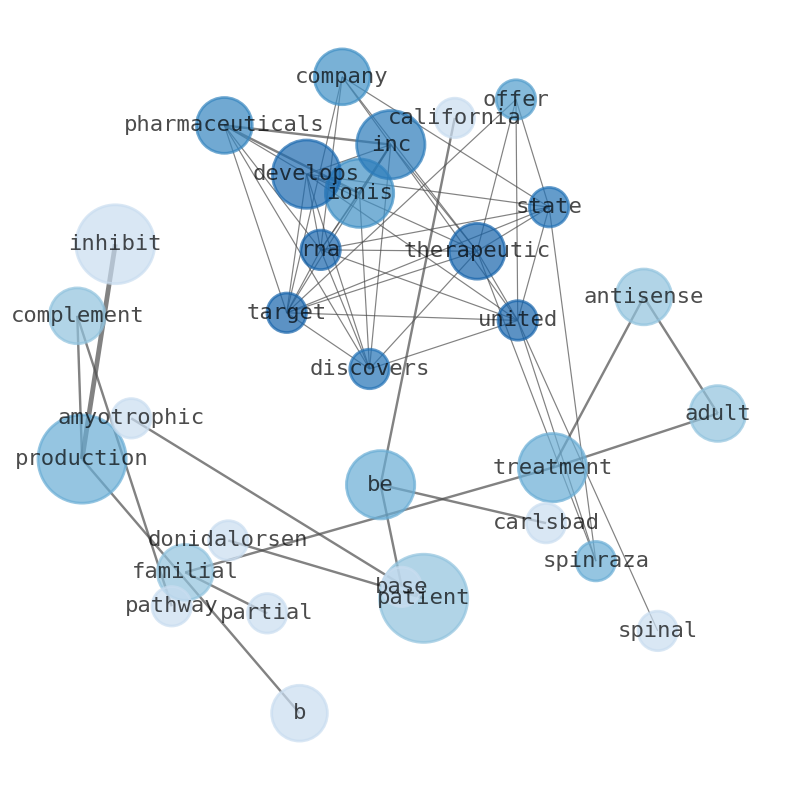 Ionis Pharmaceuticals, Inc. discovers and develops RNA-targeted therapeutics in the United States. The company offers SPINRAZA for spinal muscular atrophy (SMA) in pediatric and adult patients; TEGSEDI, an antisense injection for the treatment of polyneuropathy caused by hereditary transthyretin amyloidosis in adults; and WAYLIVRA, an antisense medicine for treatment for familial chylomicronemia syndrome (FCS) and familial partial lipodystrophy. It also develops medicines for various indications that are in phase 3 study, including Eplontersen as a monthly self-administered subcutaneous injection to treat all types of ATTR; Olezarsen for patients with FCS and severe hypertriglyceridemia (SHTG); Donidalorsen for patients with hereditary angioedema; ION363 for patients with amyotrophic lateral sclerosis; Tofersen to inhibit the production of superoxide dismutase 1; Pelacarsen for patients with established cardiovascular disease and elevated lipoprotein(a); and Bepirovirsen to inhibit the production of viral proteins associated with hepatitis B virus. In addition, the company develops Cimdelirsen to inhibit the production of growth hormone receptor; IONIS-FB-LRx to inhibit the production of complement factor B and the alternative complement pathway; and ION224 to reduce the production of diacylglycerol acyltransferase 2. It has a strategic collaboration with Biogen for the treatment of neurological disorders; and collaboration and license agreement with Metagenomi, Inc, AstraZeneca, Bayer AG, GlaxoSmithKline plc, Novartis, Roche, Swedish Orphan Biovitrum AB, and PTC Therapeutics. Ionis Pharmaceuticals, Inc. was incorporated in 1989 and is based in Carlsbad, California.