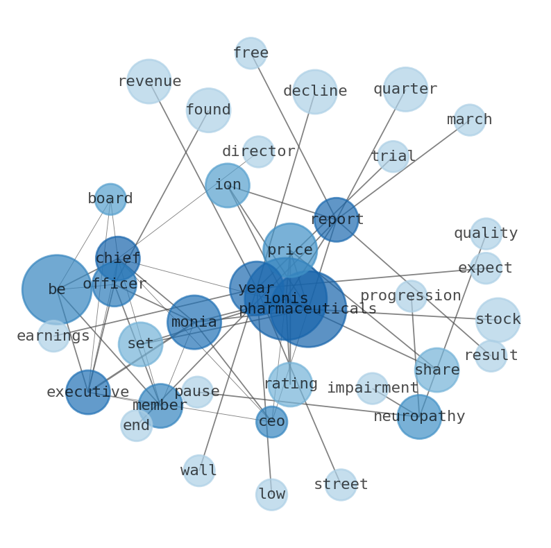 Are looking for the most relevant information about Ionis Pharmaceuticals? Investor spend a lot of time searching for information to make investment decisions in Ionis Pharmaceuticals. This task is often burdensome and consumes huge amounts of free time. It also leads to mistakes due to fatigue and bounded rationality. As a solution, we programmed an artificial intelligence that reads the whole internet and the uses natural language processing and vectorizers to summarize the information. Usually, the AI reads several hundred pages and summarize it to a short document. This document presents our results. We found that the most common words in the internet about Ionis Pharmaceuticals are: Ionis, Pharmaceuticals, Monia, price, chief, executive, officer, and the most common words in the summary are: ionis, pharmaceutical, stock, back, inc, main, investor, . One of the sentences in the summary was: The revenue for the current quarter was down 65.5% compared to …