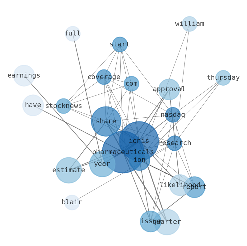 This document will help you to evaluate Ionis Pharmaceuticals without reading an infinite amount of sources. Relying only on stock quotes or prices to make investment decisions is a mistake. Analyzing and observing stock charts, highs and lows and other numerical data does not allow to evaluate the real value of a company. Stock quotes and prices are the result of underlying characteristics of a company and of events and news happening around them. For this reason, investing must be based on information, not numbers. As a solution, we programmed an artificial intelligence that reads the whole internet and the uses natural language processing and vectorizers to summarize the information. Usually, the AI reads several hundred pages and summarize it to a short document. This document presents our results. We found that the most common words in the internet about Ionis Pharmaceuticals are: Ionis, Pharmaceuticals, share, report, issue, EPS, estimate, and the most common words in the summary are: pharmaceutical, ionis, stock, inc, market, company, report, . One of the sentences in the summary was: Banque Cantonale Vaudoise lifted its holdings in shares of Ionis.. Other searches related to this term that the AI found were: stockmarketlive, livestock, stockmarketforbeginners, thestockmarket, stockmarkettoday, stockmarkettrading, stockmarketstocks, todaystockmarket, thestockmarket, marketnews, stockmarketnews, whatisstockmarket, usstockmarket, stockmarketopen. #pharmaceutical #ionis #stock #inc #market #company #report.