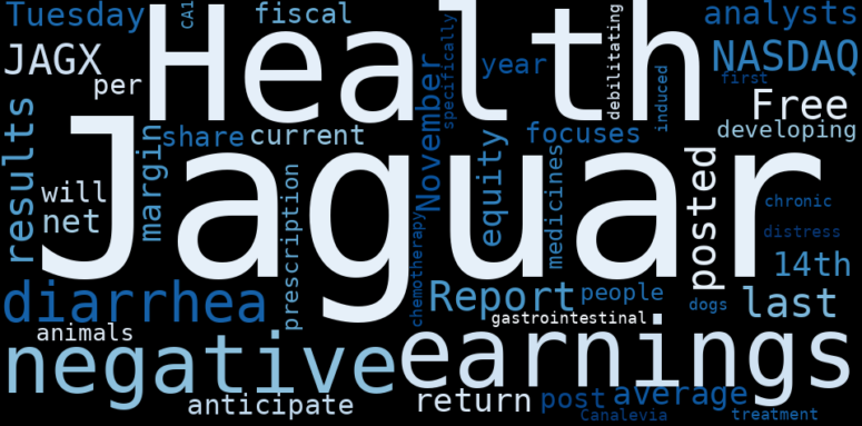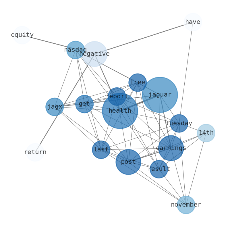 This document will help you to evaluate Jaguar Health without reading an infinite amount of sources. Relying only on stock quotes or prices to make investment decisions is a mistake. Analyzing and observing stock charts, highs and lows and other numerical data does not allow to evaluate the real value of a company. Stock quotes and prices are the result of underlying characteristics of a company and of events and news happening around them. For this reason, investing must be based on information, not numbers. As a solution, we programmed an artificial intelligence that reads the whole internet and the uses natural language processing and vectorizers to summarize the information. Usually, the AI reads several hundred pages and summarize it to a short document. This document presents our results. We found that the most common words in the internet about Jaguar Health are: Jaguar, Health, post, earnings, negative, diarrhea, NASDAQJAGX, …
