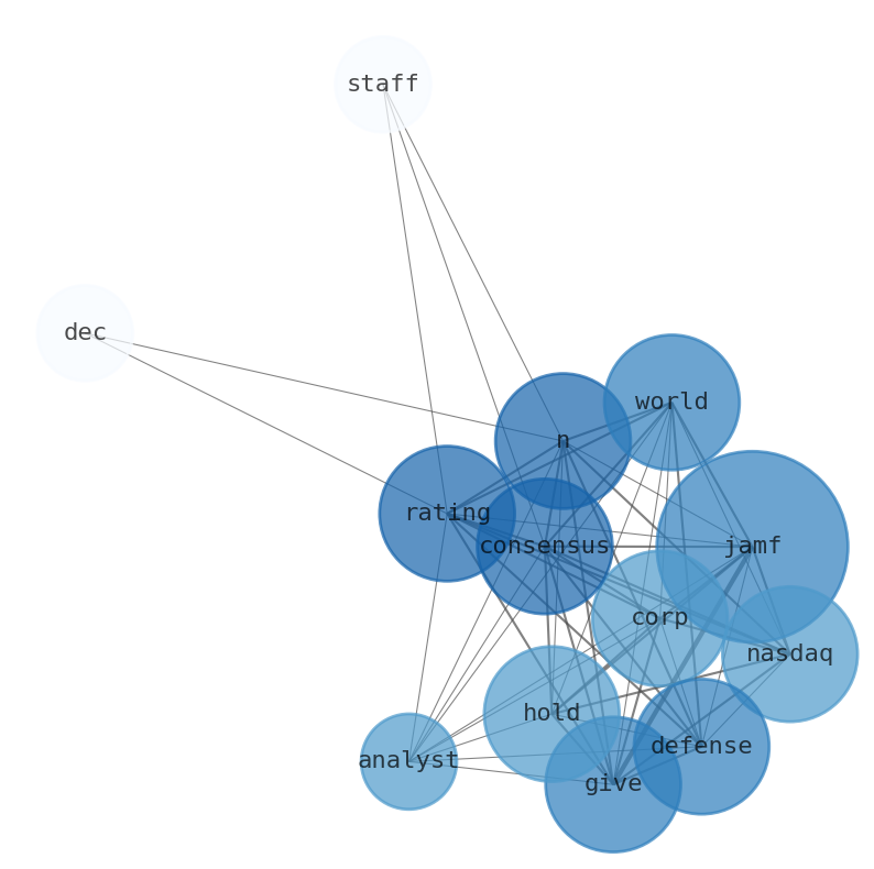 This document will help you to evaluate Jamf Holding without reading an infinite amount of sources. Relying only on stock quotes or prices to make investment decisions is a mistake. Analyzing and observing stock charts, highs and lows and other numerical data does not allow to evaluate the real value of a company. Stock quotes and prices are the result of underlying characteristics of a company and of events and news happening around them. For this reason, investing must be based on information, not numbers. As a solution, we programmed an artificial intelligence that reads the whole internet and the uses natural language processing and vectorizers to summarize the information. Usually, the AI reads several hundred pages and summarize it to a short document. This document presents our results. We found that the most common words in the internet about Jamf Holding are: give, consensus, rating, Jamf, Holding, Corp, NASDAQJAMF, …