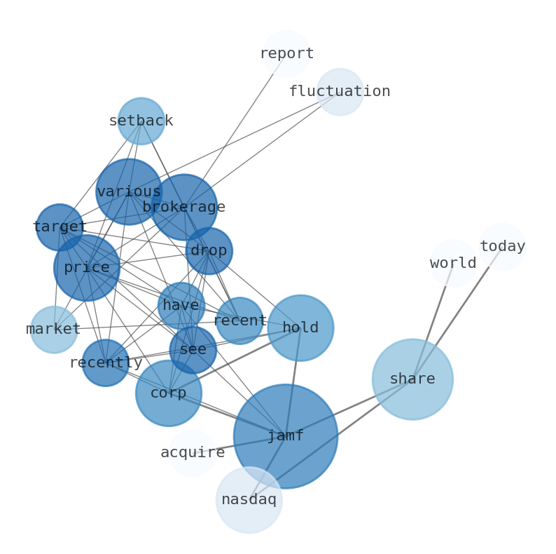 This document will help you to evaluate Jamf Holding without reading an infinite amount of sources. Relying only on stock quotes or prices to make investment decisions is a mistake. Analyzing and observing stock charts, highs and lows and other numerical data does not allow to evaluate the real value of a company. Stock quotes and prices are the result of underlying characteristics of a company and of events and news happening around them. For this reason, investing must be based on information, not numbers. As a solution, we programmed an artificial intelligence that reads the whole internet and the uses natural language processing and vectorizers to summarize the information. Usually, the AI reads several hundred pages and summarize it to a short document. This document presents our results. We found that the most common words in the internet about Jamf Holding are: Jamf, price, various, brokerage, share, Holding, Corp, …