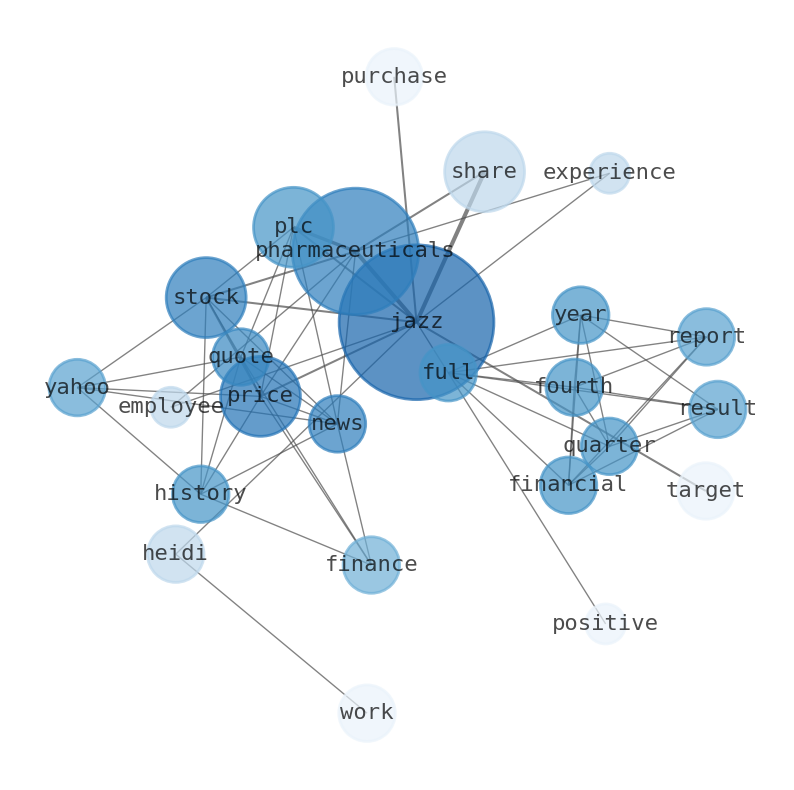 This document will help you to evaluate Jazz Pharmaceuticals without reading an infinite amount of sources. Relying only on stock quotes or prices to make investment decisions is a mistake. Analyzing and observing stock charts, highs and lows and other numerical data does not allow to evaluate the real value of a company. Stock quotes and prices are the result of underlying characteristics of a company and of events and news happening around them. For this reason, investing must be based on information, not numbers. As a solution, we programmed an artificial intelligence that reads the whole internet and the uses natural language processing and vectorizers to summarize the information. Usually, the AI reads several hundred pages and summarize it to a short document. This document presents our results. We found that the most common words in the internet about Jazz Pharmaceuticals are: Jazz, Pharmaceuticals, jazz, plc, pharmaceutical, stock, price, and the most common words in the summary are: jazz, pharmaceutical, stock, news, company, plc, report, . One of the sentences in the summary was: Canada Pension Plan Investment Board Purchases 72,900 Shares of jazz Pharmaceuticals.. Other searches related to this term that the AI found were: stockmarketlive, livestock, stockmarketforbeginners, thestockmarket, stockmarkettoday, stockmarkettrading, stockmarketstocks, todaystockmarket, thestockmarket, marketnews, stockmarketnews, whatisstockmarket, usstockmarket, stockmarketopen. #jazz #pharmaceutical #stock #news #company #plc #report.