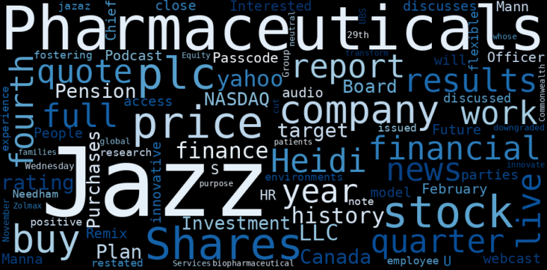 Are looking for the most relevant information about Jazz Pharmaceuticals? Investor spend a lot of time searching for information to make investment decisions in Jazz Pharmaceuticals. This task is often burdensome and consumes huge amounts of free time. It also leads to mistakes due to fatigue and bounded rationality. As a solution, we programmed an artificial intelligence that reads the whole internet and the uses natural language processing and vectorizers to summarize the information. Usually, the AI reads several hundred pages and summarize it to a short document. This document presents our results. We found that the most common words in the internet about Jazz Pharmaceuticals are: Jazz, Pharmaceuticals, jazz, plc, pharmaceutical, stock, price, and the most common words in the summary are: jazz, pharmaceutical, stock, news, company, plc, report, . One of the sentences in the summary was: Canada Pension Plan Investment Board Purchases 72,900 Shares of jazz Pharmaceuticals.. …