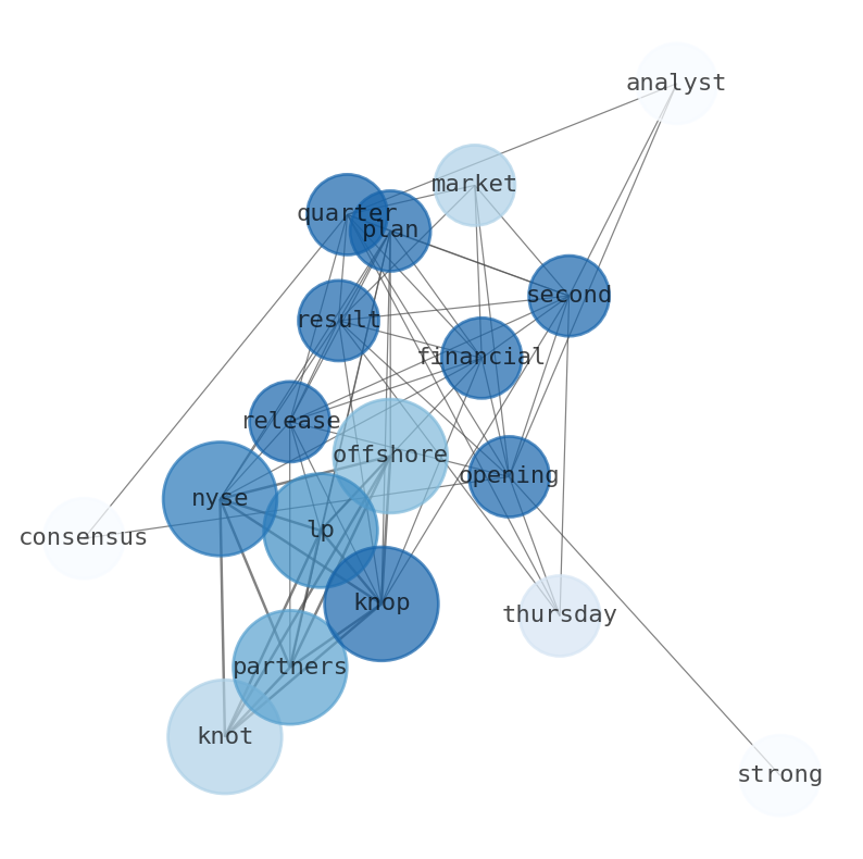 This document will help you to evaluate KNOT Offshore Partners without reading an infinite amount of sources. Relying only on stock quotes or prices to make investment decisions is a mistake. Analyzing and observing stock charts, highs and lows and other numerical data does not allow to evaluate the real value of a company. Stock quotes and prices are the result of underlying characteristics of a company and of events and news happening around them. For this reason, investing must be based on information, not numbers. As a solution, we programmed an artificial intelligence that reads the whole internet and the uses natural language processing and vectorizers to summarize the information. Usually, the AI reads several hundred pages and summarize it to a short document. This document presents our results. We found that the most common words in the internet about KNOT Offshore Partners are: KNOT, Offshore, Partners, LP, NYSEKNOP, …