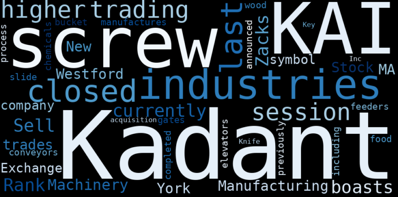 Are looking for the most relevant information about Kadant? Investor spend a lot of time searching for information to make investment decisions in Kadant. This task is often burdensome and consumes huge amounts of free time. It also leads to mistakes due to fatigue and bounded rationality. As a solution, we programmed an artificial intelligence that reads the whole internet and the uses natural language processing and vectorizers to summarize the information. Usually, the AI reads several hundred pages and summarize it to a short document. This document presents our results. We found that the most common words in the internet about Kadant are: Kadant, KAI, screw, industry, close, last, trading, and the most common words in the summary are: kadant, job, feb07, dont, know, wanna, company, . One of the sentences in the summary was: Kadant currently boasts a Zacks Rank of #4 (Sell) Kadant Machinery Manufacturing Westford, MA, …