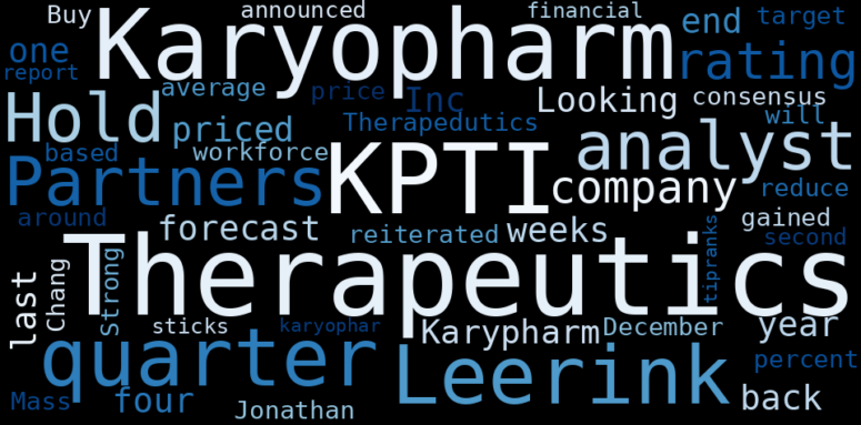 Are looking for the most relevant information about Karyopharm Therapeutics? Investor spend a lot of time searching for information to make investment decisions in Karyopharm Therapeutics. This task is often burdensome and consumes huge amounts of free time. It also leads to mistakes due to fatigue and bounded rationality. As a solution, we programmed an artificial intelligence that reads the whole internet and the uses natural language processing and vectorizers to summarize the information. Usually, the AI reads several hundred pages and summarize it to a short document. This document presents our results. We found that the most common words in the internet about Karyopharm Therapeutics are: Karyopharm, Therapeutics, KPTI, price, analyst, rating, company, and the most common words in the summary are: therapeutic, karyopharm, inc, company, stock, cancer, biotech, . One of the sentences in the summary was: Leerink Partners analyst Jonathan Chang reiterated a Hold rating on Karyopharm …