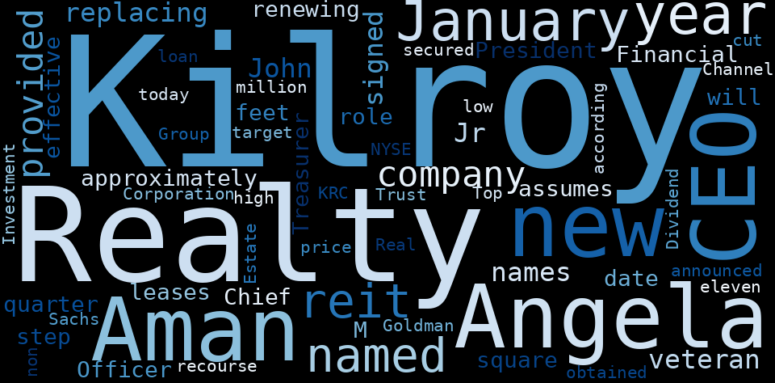 Are looking for the most relevant information about Kilroy Realty? Investor spend a lot of time searching for information to make investment decisions in Kilroy Realty. This task is often burdensome and consumes huge amounts of free time. It also leads to mistakes due to fatigue and bounded rationality. As a solution, we programmed an artificial intelligence that reads the whole internet and the uses natural language processing and vectorizers to summarize the information. Usually, the AI reads several hundred pages and summarize it to a short document. This document presents our results. We found that the most common words in the internet about Kilroy Realty are: Kilroy, Realty, name, new, January, Angela, Aman, and the most common words in the summary are: kilroy, realty, stock, market, krc, los, corporation, . One of the sentences in the summary was: Angela M. Other searches related to this term that the AI …