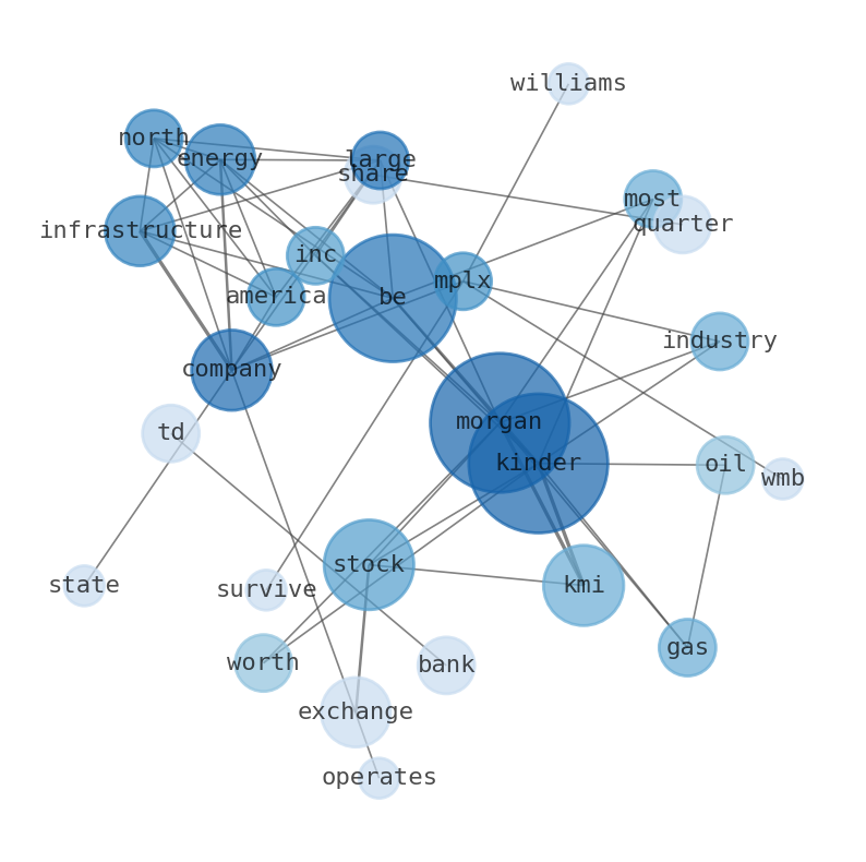 Are looking for the most relevant information about Kinder Morgan? Investor spend a lot of time searching for information to make investment decisions in Kinder Morgan. This task is often burdensome and consumes huge amounts of free time. It also leads to mistakes due to fatigue and bounded rationality. As a solution, we programmed an artificial intelligence that reads the whole internet and the uses natural language processing and vectorizers to summarize the information. Usually, the AI reads several hundred pages and summarize it to a short document. This document presents our results. We found that the most common words in the internet about Kinder Morgan are: Kinder, Morgan, KMI, Exchange, stock, infrastructure, energy, and the most common words in the summary are: morgan, kinder, stock, market, night, party, pipeline, . One of the sentences in the summary was: Kinder Morgan is expected to post earnings of $0.24 per share …