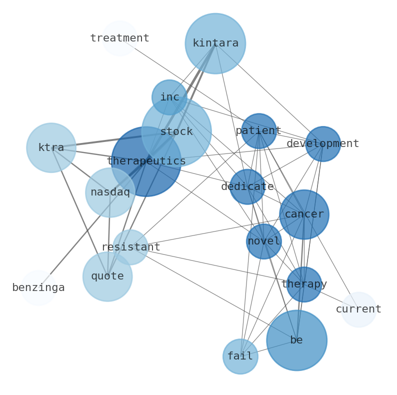 Are looking for the most relevant information about Kintara Therapeutics? Investor spend a lot of time searching for information to make investment decisions in Kintara Therapeutics. This task is often burdensome and consumes huge amounts of free time. It also leads to mistakes due to fatigue and bounded rationality. As a solution, we programmed an artificial intelligence that reads the whole internet and the uses natural language processing and vectorizers to summarize the information. Usually, the AI reads several hundred pages and summarize it to a short document. This document presents our results. We found that the most common words in the internet about Kintara Therapeutics are: stock, Kintara, Therapeutics, cancer, quote, therapeutic, Inc, and the most common words in the summary are: therapeutic, pharmaceutical, inc, follow, nasdaq, pharma, bioscience, . One of the sentences in the summary was: kintar therapeutics. Other searches related to this term that the AI found were: stockmarketlive, livestock, stockmarketforbeginners, thestockmarket, stockmarkettoday, stockmarkettrading, stockmarketstocks, todaystockmarket, thestockmarket, marketnews, stockmarketnews, whatisstockmarket, usstockmarket, stockmarketopen. #therapeutic #pharmaceutical #inc #follow #nasdaq #pharma #bioscience.