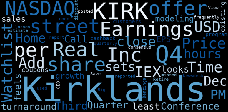 How much time have you spent trying to decide whether investing in Kirklands? Many investors start with the dream of being free. They expect to find on the stock market an option to have time to develop their own interests and hobbies. That is, a way to escape a 9 to 5 job. However, investment is complex and investors end up spending whole days (and nights) trying to figure out which the right stock to invest is. The dream of stock investing becomes the nightmare of facing infinity amounts of information. As a solution, we programmed an artificial intelligence that reads the whole internet and the uses natural language processing and vectorizers to summarize the information. Usually, the AI reads several hundred pages and summarize it to a short document. This document presents our results. We found that the most common words in the internet about Kirklands are: Kirklands, Q4, …