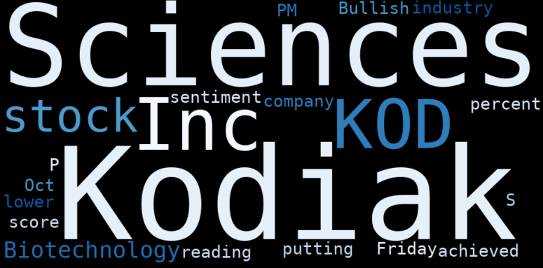 Kodiak Sciences Inc (KOD) stock is up 7.19% while the S&P 500 is lower by -0.67% as of 1:12 PM on Friday, Oct 20. Kodiak sciences Inc (kod) achieved a score of 38 in the Biotechnology industry, putting it above 38 percent of Biotechnology stocks. The company has a Bullish sentiment reading.