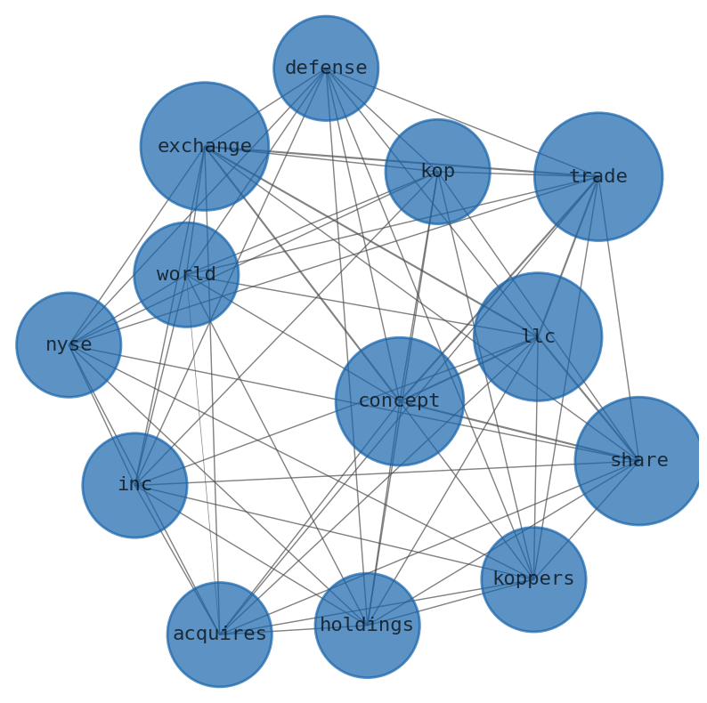 This document will help you to evaluate Koppers Holdings without reading an infinite amount of sources. Relying only on stock quotes or prices to make investment decisions is a mistake. Analyzing and observing stock charts, highs and lows and other numerical data does not allow to evaluate the real value of a company. Stock quotes and prices are the result of underlying characteristics of a company and of events and news happening around them. For this reason, investing must be based on information, not numbers. As a solution, we programmed an artificial intelligence that reads the whole internet and the uses natural language processing and vectorizers to summarize the information. Usually, the AI reads several hundred pages and summarize it to a short document. This document presents our results. We found that the most common words in the internet about Koppers Holdings are: Exchange, Concepts, LLC, acquire, share, defense, world, …