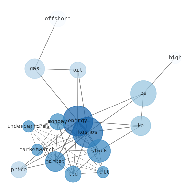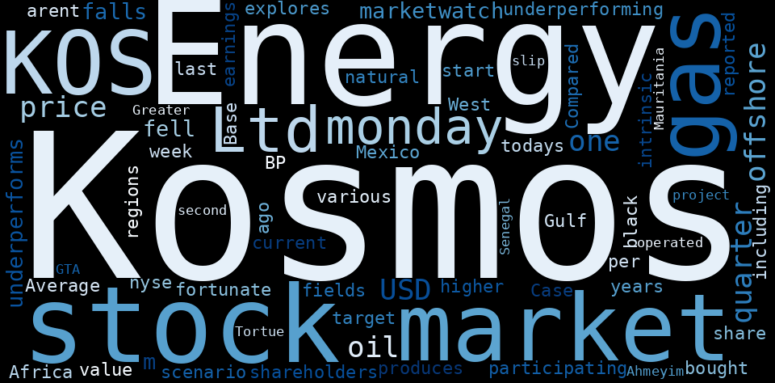 This document will help you to evaluate Kosmos Energy without reading an infinite amount of sources. Relying only on stock quotes or prices to make investment decisions is a mistake. Analyzing and observing stock charts, highs and lows and other numerical data does not allow to evaluate the real value of a company. Stock quotes and prices are the result of underlying characteristics of a company and of events and news happening around them. For this reason, investing must be based on information, not numbers. As a solution, we programmed an artificial intelligence that reads the whole internet and the uses natural language processing and vectorizers to summarize the information. Usually, the AI reads several hundred pages and summarize it to a short document. This document presents our results. We found that the most common words in the internet about Kosmos Energy are: Kosmos, Energy, stock, market, energy, gas, kosmos, …