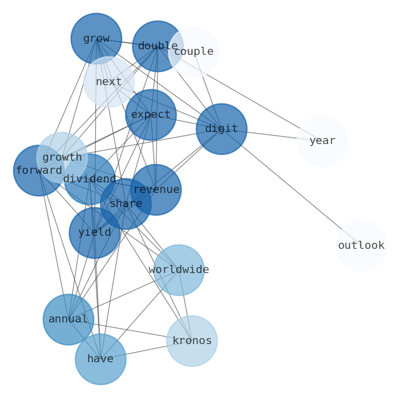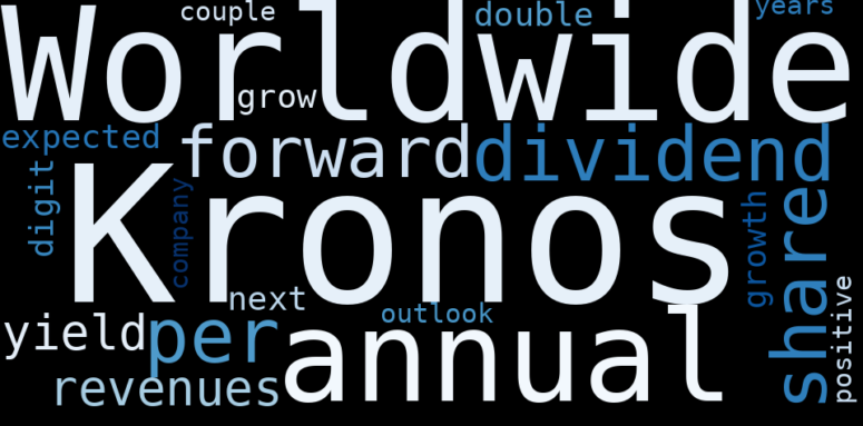 This document will help you to evaluate Kronos Worldwide without reading an infinite amount of sources. Relying only on stock quotes or prices to make investment decisions is a mistake. Analyzing and observing stock charts, highs and lows and other numerical data does not allow to evaluate the real value of a company. Stock quotes and prices are the result of underlying characteristics of a company and of events and news happening around them. For this reason, investing must be based on information, not numbers. As a solution, we programmed an artificial intelligence that reads the whole internet and the uses natural language processing and vectorizers to summarize the information. Usually, the AI reads several hundred pages and summarize it to a short document. This document presents our results. We found that the most common words in the internet about Kronos Worldwide are: Kronos, Worldwide, annual, dividend, share, forward, yield, …