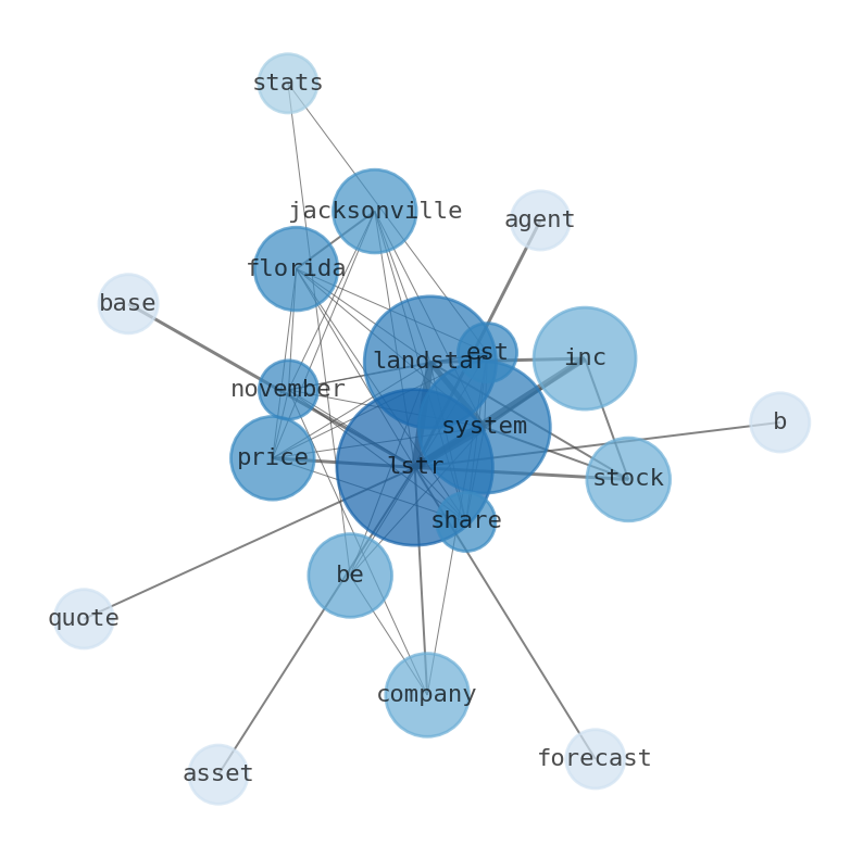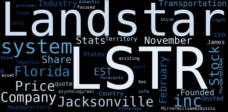 This document will help you to evaluate Landstar System without reading an infinite amount of sources. Relying only on stock quotes or prices to make investment decisions is a mistake. Analyzing and observing stock charts, highs and lows and other numerical data does not allow to evaluate the real value of a company. Stock quotes and prices are the result of underlying characteristics of a company and of events and news happening around them. For this reason, investing must be based on information, not numbers. As a solution, we programmed an artificial intelligence that reads the whole internet and the uses natural language processing and vectorizers to summarize the information. Usually, the AI reads several hundred pages and summarize it to a short document. This document presents our results. We found that the most common words in the internet about Landstar System are: Landstar, LSTR, system, System, Jacksonville, Florida, Price, …