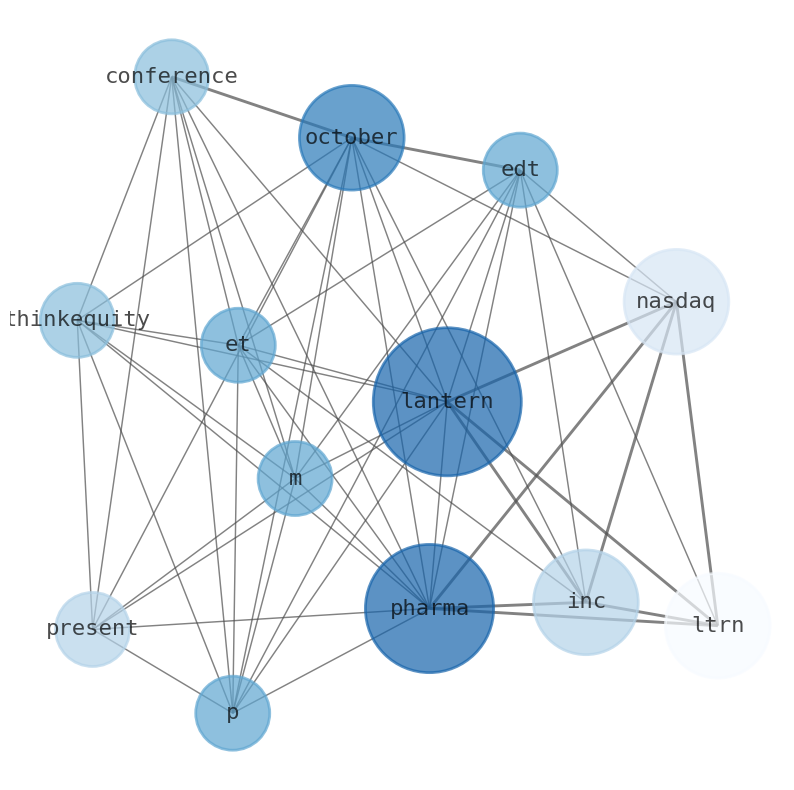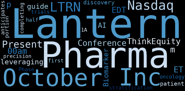 Are looking for the most relevant information about Lantern Pharma? Investor spend a lot of time searching for information to make investment decisions in Lantern Pharma. This task is often burdensome and consumes huge amounts of free time. It also leads to mistakes due to fatigue and bounded rationality. As a solution, we programmed an artificial intelligence that reads the whole internet and the uses natural language processing and vectorizers to summarize the information. Usually, the AI reads several hundred pages and summarize it to a short document. This document presents our results. We found that the most common words in the internet about Lantern Pharma are: Lantern, Pharma, October, Inc, Nasdaq, LTRN, Present, and the most common words in the summary are: pm, nov, pharma, lantern, oct, inc, news, . One of the sentences in the summary was: Lantern anticipates completing the Phase 1A portion by the first half …