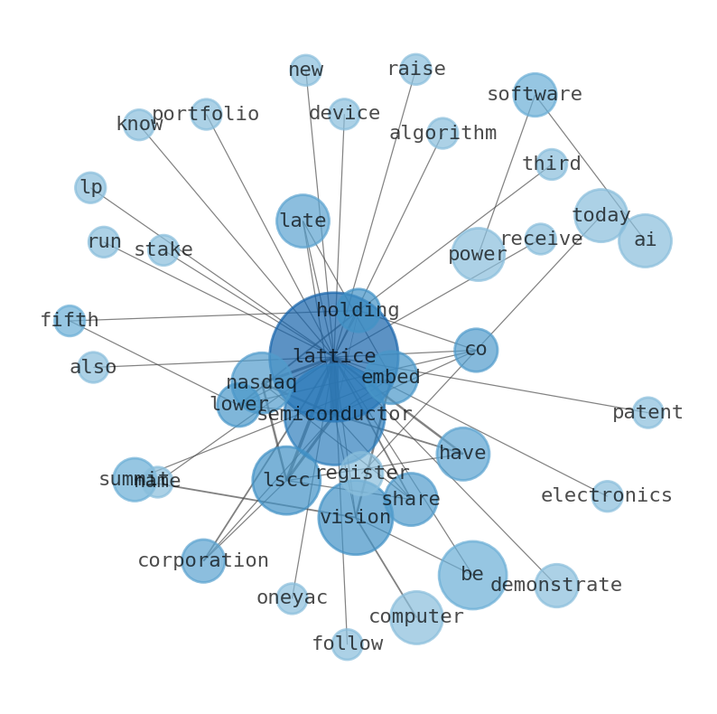 This document will help you to evaluate Lattice Semiconductor without reading an infinite amount of sources. Relying only on stock quotes or prices to make investment decisions is a mistake. Analyzing and observing stock charts, highs and lows and other numerical data does not allow to evaluate the real value of a company. Stock quotes and prices are the result of underlying characteristics of a company and of events and news happening around them. For this reason, investing must be based on information, not numbers. As a solution, we programmed an artificial intelligence that reads the whole internet and the uses natural language processing and vectorizers to summarize the information. Usually, the AI reads several hundred pages and summarize it to a short document. This document presents our results. We found that the most common words in the internet about Lattice Semiconductor are: Lattice, Semiconductor, Lattices, vision, share, LSCC, today, …