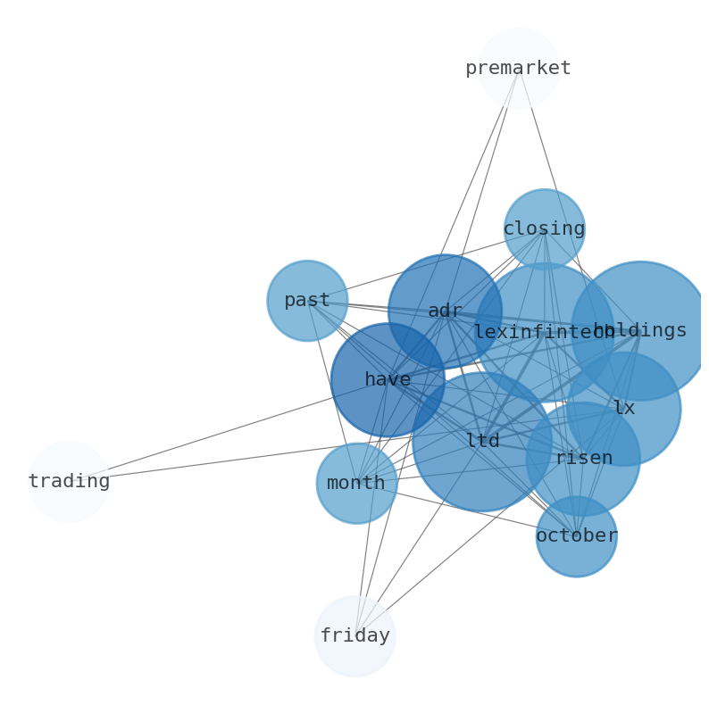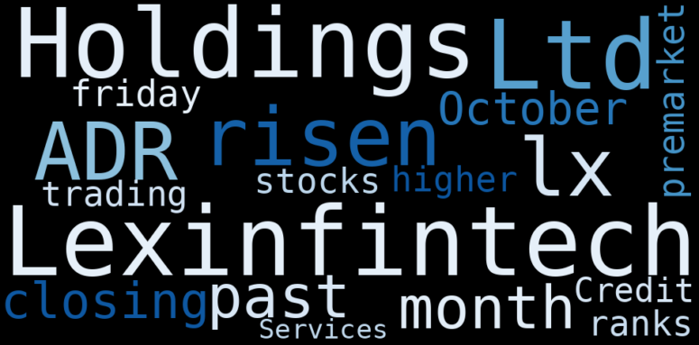 Are looking for the most relevant information about LexinFintech Holdings? Investor spend a lot of time searching for information to make investment decisions in LexinFintech Holdings. This task is often burdensome and consumes huge amounts of free time. It also leads to mistakes due to fatigue and bounded rationality. As a solution, we programmed an artificial intelligence that reads the whole internet and the uses natural language processing and vectorizers to summarize the information. Usually, the AI reads several hundred pages and summarize it to a short document. This document presents our results. We found that the most common words in the internet about LexinFintech Holdings are: Holdings, Ltd, rise, Lexinfintech, LexinFintech, ADR, past, and the most common words in the summary are: holding, stock, paypal, lexinfintech, penny, ltd, screener, . One of the sentences in the summary was: Lexinfintech holdings ltd - adr (lx) has risen 3.43% friday in …