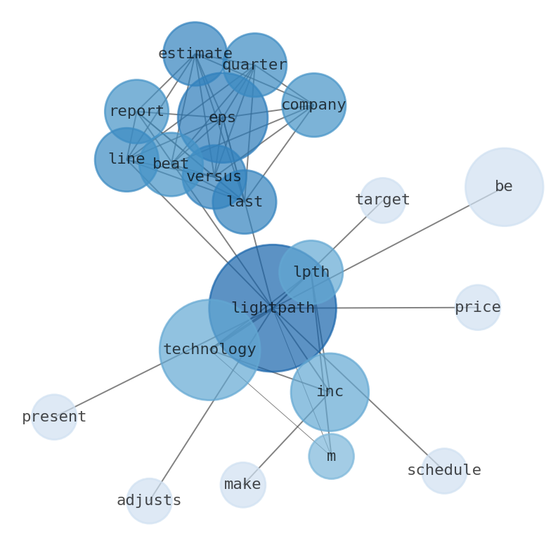 This document will help you to evaluate LightPath Technologies without reading an infinite amount of sources. Relying only on stock quotes or prices to make investment decisions is a mistake. Analyzing and observing stock charts, highs and lows and other numerical data does not allow to evaluate the real value of a company. Stock quotes and prices are the result of underlying characteristics of a company and of events and news happening around them. For this reason, investing must be based on information, not numbers. As a solution, we programmed an artificial intelligence that reads the whole internet and the uses natural language processing and vectorizers to summarize the information. Usually, the AI reads several hundred pages and summarize it to a short document. This document presents our results. We found that the most common words in the internet about LightPath Technologies are: LightPath, Technologies, EPS, LPTH, Inc, report, inline, …