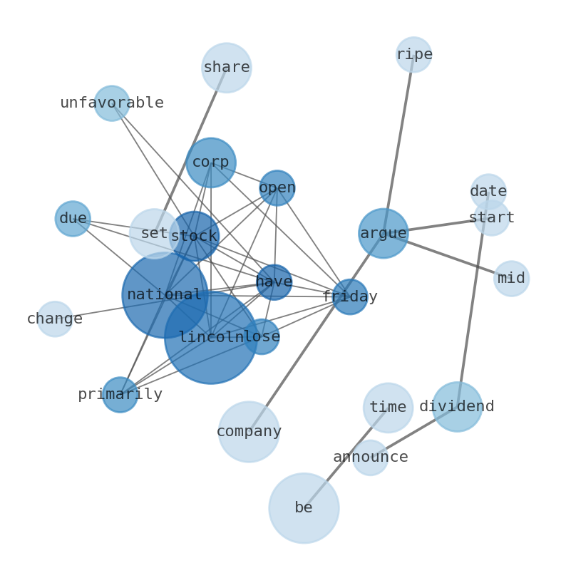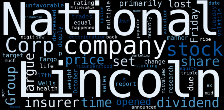 Are looking for the most relevant information about Lincoln National? Investor spend a lot of time searching for information to make investment decisions in Lincoln National. This task is often burdensome and consumes huge amounts of free time. It also leads to mistakes due to fatigue and bounded rationality. As a solution, we programmed an artificial intelligence that reads the whole internet and the uses natural language processing and vectorizers to summarize the information. Usually, the AI reads several hundred pages and summarize it to a short document. This document presents our results. We found that the most common words in the internet about Lincoln National are: Lincoln, National, Corp, stock, price, share, set, and the most common words in the summary are: lincoln, national, news, financial, share, group, company, . One of the sentences in the summary was: Lincoln National stock has lost 58% since 2021 primarily due to unfavorable change in price to sales multiple (p/s). Other searches related to this term that the AI found were: stockmarketlive, livestock, stockmarketforbeginners, thestockmarket, stockmarkettoday, stockmarkettrading, stockmarketstocks, todaystockmarket, thestockmarket, marketnews, stockmarketnews, whatisstockmarket, usstockmarket, stockmarketopen. #lincoln #national #news #financial #share #group #company.