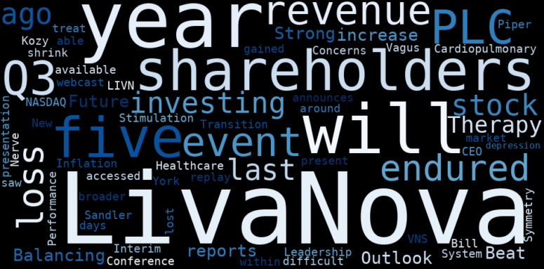 Are looking for the most relevant information about LivaNova? Investor spend a lot of time searching for information to make investment decisions in LivaNova. This task is often burdensome and consumes huge amounts of free time. It also leads to mistakes due to fatigue and bounded rationality. As a solution, we programmed an artificial intelligence that reads the whole internet and the uses natural language processing and vectorizers to summarize the information. Usually, the AI reads several hundred pages and summarize it to a short document. This document presents our results. We found that the most common words in the internet about LivaNova are: LivaNova, year, PLC, Q3, revenue, shareholder, endure, and the most common words in the summary are: patient, livanova, trial, study, system, august, february, . One of the sentences in the summary was: Shareholders lost 2.5% in the last year, while the broader market gained around 15%.. Other searches related to this term that the AI found were: stockmarketlive, livestock, stockmarketforbeginners, thestockmarket, stockmarkettoday, stockmarkettrading, stockmarketstocks, todaystockmarket, thestockmarket, marketnews, stockmarketnews, whatisstockmarket, usstockmarket, stockmarketopen. #patient #livanova #trial #study #system #august #february.