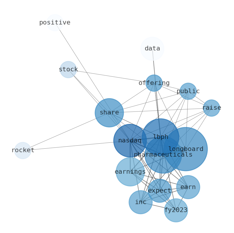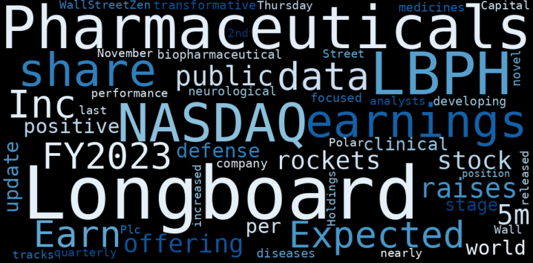 The game is changing. There is a new strategy to evaluate Longboard Pharmaceuticals fundamental value, possible risks and most salient advantages. Investors have traditionally relied in reading large amounts of text to evaluate the fundamental value of a stock or company. However, the development of Artificial Intelligence (AI) tools is modifying the way investments are evaluated in markets. Today, machine learning, natural language processing and bigdata allow making this process automatic, reducing large amounts of text to the elements that have a higher activation in a neural network. We programmed an artificial intelligence that reads the whole internet and the uses natural language processing and vectorizers to summarize the information. Usually, the AI reads several hundred pages and summarize it to a short document. This document presents our results. We found that the most common words in the internet about Longboard Pharmaceuticals are: Longboard, Pharmaceuticals, share, data, NASDAQLBPH, earnings, raise, …