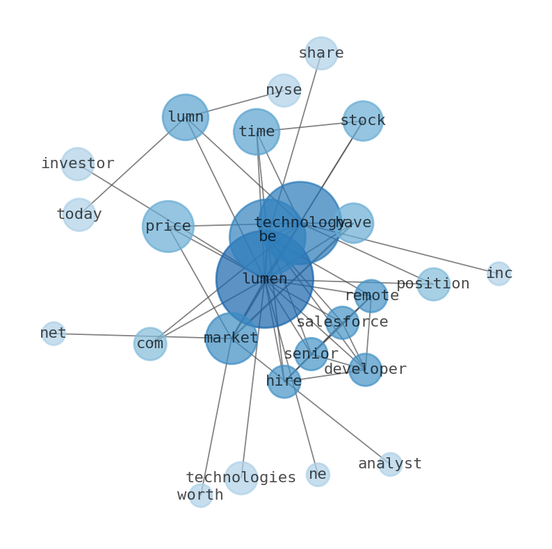 This document will help you to evaluate Lumen Technologies without reading an infinite amount of sources. Relying only on stock quotes or prices to make investment decisions is a mistake. Analyzing and observing stock charts, highs and lows and other numerical data does not allow to evaluate the real value of a company. Stock quotes and prices are the result of underlying characteristics of a company and of events and news happening around them. For this reason, investing must be based on information, not numbers. As a solution, we programmed an artificial intelligence that reads the whole internet and the uses natural language processing and vectorizers to summarize the information. Usually, the AI reads several hundred pages and summarize it to a short document. This document presents our results. We found that the most common words in the internet about Lumen Technologies are: Lumen, Technologies, market, price, company, LUMN, Price, …