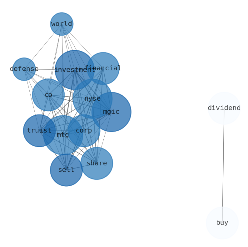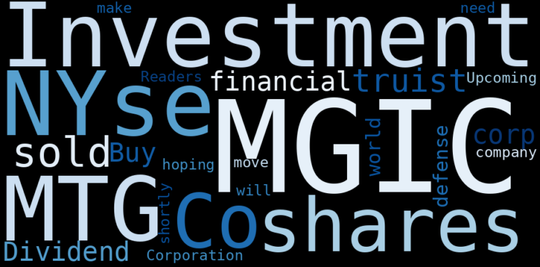 This document will help you to evaluate MGIC Investment without reading an infinite amount of sources. Relying only on stock quotes or prices to make investment decisions is a mistake. Analyzing and observing stock charts, highs and lows and other numerical data does not allow to evaluate the real value of a company. Stock quotes and prices are the result of underlying characteristics of a company and of events and news happening around them. For this reason, investing must be based on information, not numbers. As a solution, we programmed an artificial intelligence that reads the whole internet and the uses natural language processing and vectorizers to summarize the information. Usually, the AI reads several hundred pages and summarize it to a short document. This document presents our results. We found that the most common words in the internet about MGIC Investment are: MGIC, Investment, sell, Co, NYseMTG, share, truist, …