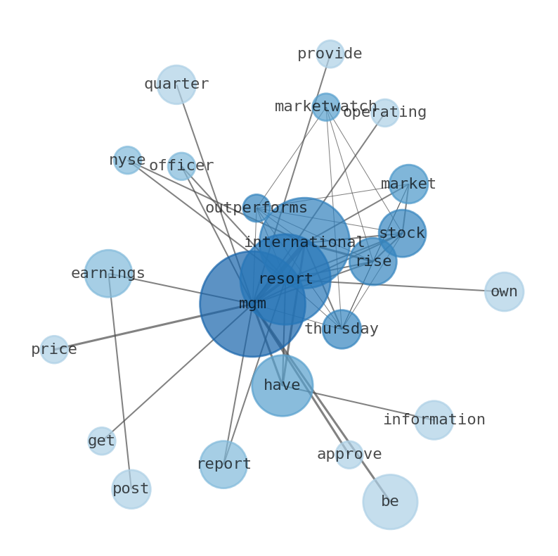 This document will help you to evaluate MGM Resorts International without reading an infinite amount of sources. Relying only on stock quotes or prices to make investment decisions is a mistake. Analyzing and observing stock charts, highs and lows and other numerical data does not allow to evaluate the real value of a company. Stock quotes and prices are the result of underlying characteristics of a company and of events and news happening around them. For this reason, investing must be based on information, not numbers. As a solution, we programmed an artificial intelligence that reads the whole internet and the uses natural language processing and vectorizers to summarize the information. Usually, the AI reads several hundred pages and summarize it to a short document. This document presents our results. We found that the most common words in the internet about MGM Resorts International are: MGM, International, Resorts, stock, rise, …