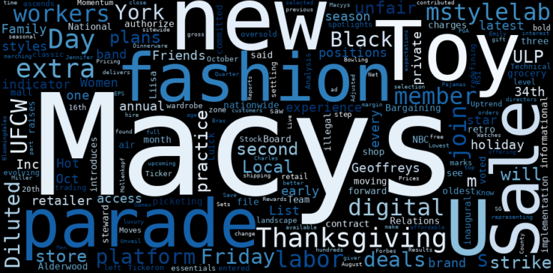 How much time have you spent trying to decide whether investing in Macys? Many investors start with the dream of being free. They expect to find on the stock market an option to have time to develop their own interests and hobbies. That is, a way to escape a 9 to 5 job. However, investment is complex and investors end up spending whole days (and nights) trying to figure out which the right stock to invest is. The dream of stock investing becomes the nightmare of facing infinity amounts of information. As a solution, we programmed an artificial intelligence that reads the whole internet and the uses natural language processing and vectorizers to summarize the information. Usually, the AI reads several hundred pages and summarize it to a short document. This document presents our results. We found that the most common words in the internet about Macys are: Macys, new, …