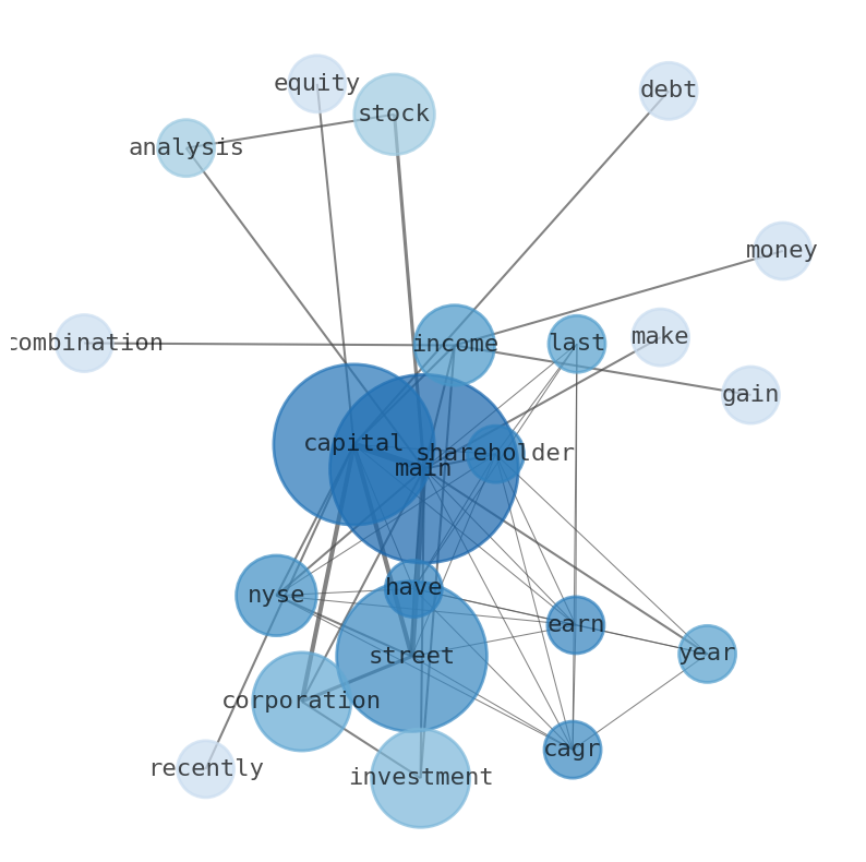 Are looking for the most relevant information about Main Street Capital? Investor spend a lot of time searching for information to make investment decisions in Main Street Capital. This task is often burdensome and consumes huge amounts of free time. It also leads to mistakes due to fatigue and bounded rationality. As a solution, we programmed an artificial intelligence that reads the whole internet and the uses natural language processing and vectorizers to summarize the information. Usually, the AI reads several hundred pages and summarize it to a short document. This document presents our results. We found that the most common words in the internet about Main Street Capital are: Main, Street, Capital, capital, investment, main, stock, and the most common words in the summary are: capital, main, street, best, investment, company, market, . One of the sentences in the summary was: Main Street is a publicly traded investment firm …