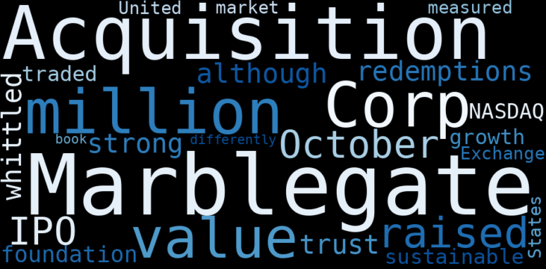 Are looking for the most relevant information about Marblegate Acquisition? Investor spend a lot of time searching for information to make investment decisions in Marblegate Acquisition. This task is often burdensome and consumes huge amounts of free time. It also leads to mistakes due to fatigue and bounded rationality. As a solution, we programmed an artificial intelligence that reads the whole internet and the uses natural language processing and vectorizers to summarize the information. Usually, the AI reads several hundred pages and summarize it to a short document. This document presents our results. We found that the most common words in the internet about Marblegate Acquisition are: Marblegate, Acquisition, Corp, value, raise, October, IPO, and the most common words in the summary are: acquisition, marblegate, corp, value, analysis, financial, company, . One of the sentences in the summary was: Marblegate Acquisition Corp. Other searches related to this term that the …