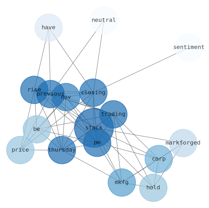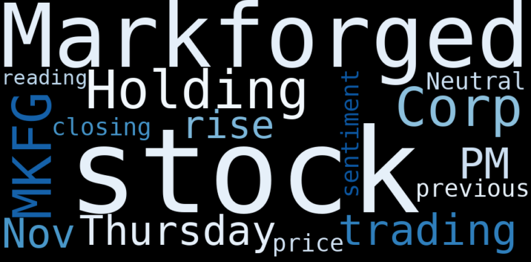 Are looking for the most relevant information about Markforged Holding? Investor spend a lot of time searching for information to make investment decisions in Markforged Holding. This task is often burdensome and consumes huge amounts of free time. It also leads to mistakes due to fatigue and bounded rationality. As a solution, we programmed an artificial intelligence that reads the whole internet and the uses natural language processing and vectorizers to summarize the information. Usually, the AI reads several hundred pages and summarize it to a short document. This document presents our results. We found that the most common words in the internet about Markforged Holding are: stock, Markforged, Holding, Corp, MKFG, trading, PM, and the most common words in the summary are: inc, holding, ltd, hold, corp, group, co, . One of the sentences in the summary was: The stock has a Neutral sentiment reading.. Other searches related to this term that the AI found were: stockmarketlive, livestock, stockmarketforbeginners, thestockmarket, stockmarkettoday, stockmarkettrading, stockmarketstocks, todaystockmarket, thestockmarket, marketnews, stockmarketnews, whatisstockmarket, usstockmarket, stockmarketopen. #inc #holding #ltd #hold #corp #group #co.