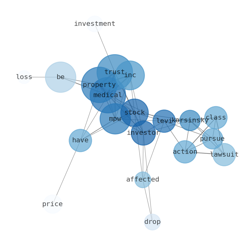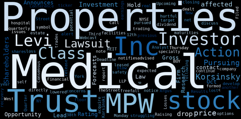 This document will help you to evaluate Medical Properties Trust without reading an infinite amount of sources. Relying only on stock quotes or prices to make investment decisions is a mistake. Analyzing and observing stock charts, highs and lows and other numerical data does not allow to evaluate the real value of a company. Stock quotes and prices are the result of underlying characteristics of a company and of events and news happening around them. For this reason, investing must be based on information, not numbers. As a solution, we programmed an artificial intelligence that reads the whole internet and the uses natural language processing and vectorizers to summarize the information. Usually, the AI reads several hundred pages and summarize it to a short document. This document presents our results. We found that the most common words in the internet about Medical Properties Trust are: Medical, Properties, Trust, MPW, Inc, …