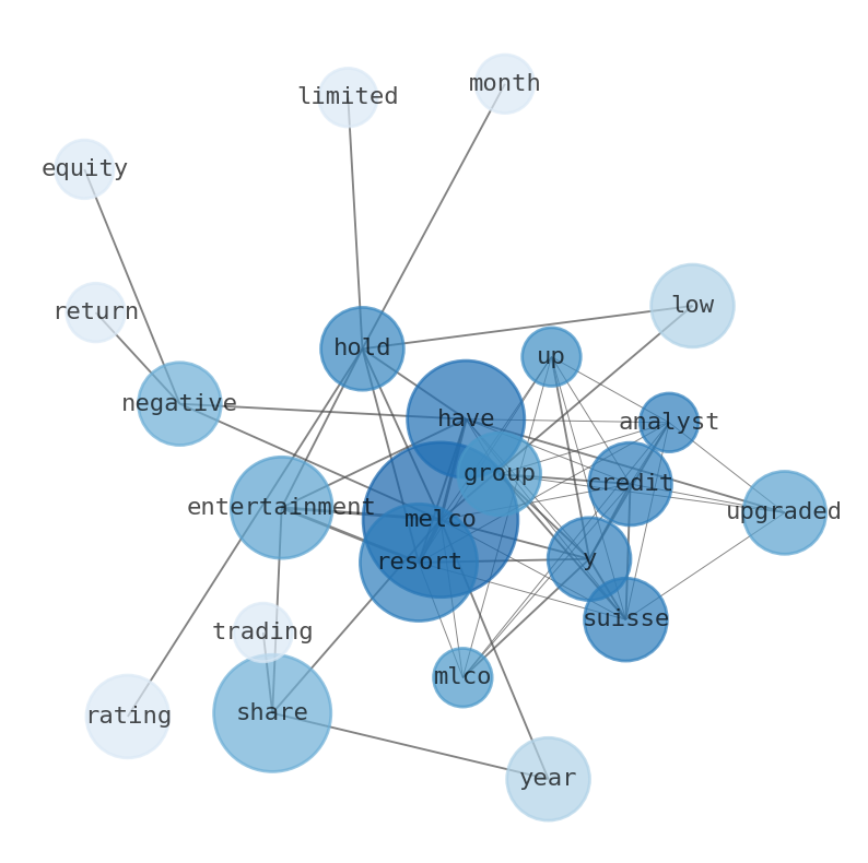 Are looking for the most relevant information about Melco Resorts & Entertainment? Investor spend a lot of time searching for information to make investment decisions in Melco Resorts & Entertainment. This task is often burdensome and consumes huge amounts of free time. It also leads to mistakes due to fatigue and bounded rationality. As a solution, we programmed an artificial intelligence that reads the whole internet and the uses natural language processing and vectorizers to summarize the information. Usually, the AI reads several hundred pages and summarize it to a short document. This document presents our results. We found that the most common words in the internet about Melco Resorts & Entertainment are: Melco, Resorts, share, Entertainment, Credit, Suisse, Group, and the most common words in the summary are: resort, stock, melco, entertainment, market, share, get, . One of the sentences in the summary was: Melco had a negative net …