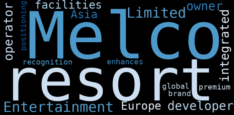 The game is changing. There is a new strategy to evaluate Melco Resorts & Entertainment fundamental value, possible risks and most salient advantages. Investors have traditionally relied in reading large amounts of text to evaluate the fundamental value of a stock or company. However, the development of Artificial Intelligence (AI) tools is modifying the way investments are evaluated in markets. Today, machine learning, natural language processing and bigdata allow making this process automatic, reducing large amounts of text to the elements that have a higher activation in a neural network. We programmed an artificial intelligence that reads the whole internet and the uses natural language processing and vectorizers to summarize the information. Usually, the AI reads several hundred pages and summarize it to a short document. This document presents our results. We found that the most common words in the internet about Melco Resorts & Entertainment are: Melco, Resorts, Entertainment, …
