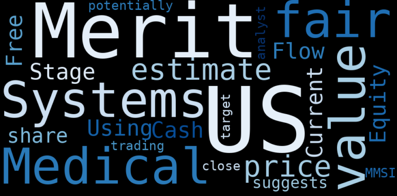 Are looking for the most relevant information about Merit Medical Systems? Investor spend a lot of time searching for information to make investment decisions in Merit Medical Systems. This task is often burdensome and consumes huge amounts of free time. It also leads to mistakes due to fatigue and bounded rationality. As a solution, we programmed an artificial intelligence that reads the whole internet and the uses natural language processing and vectorizers to summarize the information. Usually, the AI reads several hundred pages and summarize it to a short document. This document presents our results. We found that the most common words in the internet about Merit Medical Systems are: Merit, Systems, fair, value, estimate, price, Using, and the most common words in the summary are: medical, merit, system, health, service, care, news, . One of the sentences in the summary was: Using the 2 Stage Free Cash Flow to …