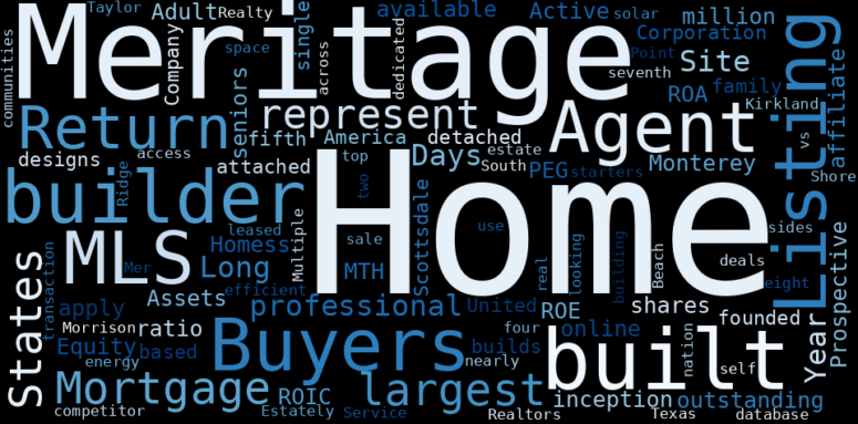 How much time have you spent trying to decide whether investing in Meritage Homes? Many investors start with the dream of being free. They expect to find on the stock market an option to have time to develop their own interests and hobbies. That is, a way to escape a 9 to 5 job. However, investment is complex and investors end up spending whole days (and nights) trying to figure out which the right stock to invest is. The dream of stock investing becomes the nightmare of facing infinity amounts of information. As a solution, we programmed an artificial intelligence that reads the whole internet and the uses natural language processing and vectorizers to summarize the information. Usually, the AI reads several hundred pages and summarize it to a short document. This document presents our results. We found that the most common words in the internet about Meritage Homes are: …