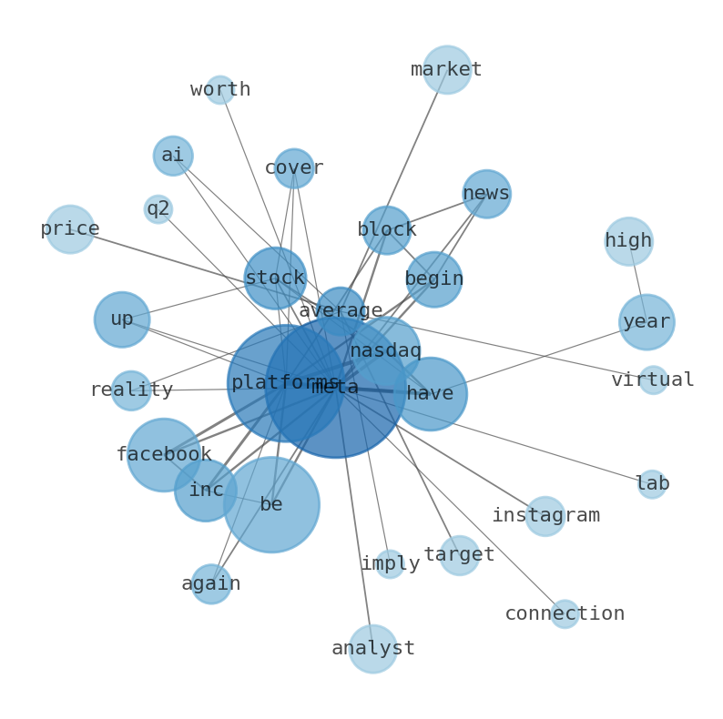 Are looking for the most relevant information about Meta Platforms? Investor spend a lot of time searching for information to make investment decisions in Meta Platforms. This task is often burdensome and consumes huge amounts of free time. It also leads to mistakes due to fatigue and bounded rationality. As a solution, we programmed an artificial intelligence that reads the whole internet and the uses natural language processing and vectorizers to summarize the information. Usually, the AI reads several hundred pages and summarize it to a short document. This document presents our results. We found that the most common words in the internet about Meta Platforms are: Meta, Platforms, Facebook, stock, company, platform, Inc, and the most common words in the summary are: meta, platform, stock, facebook, market, news, price, . One of the sentences in the summary was: The Nasdaq has risen nearly 40% since the beginning of the …
