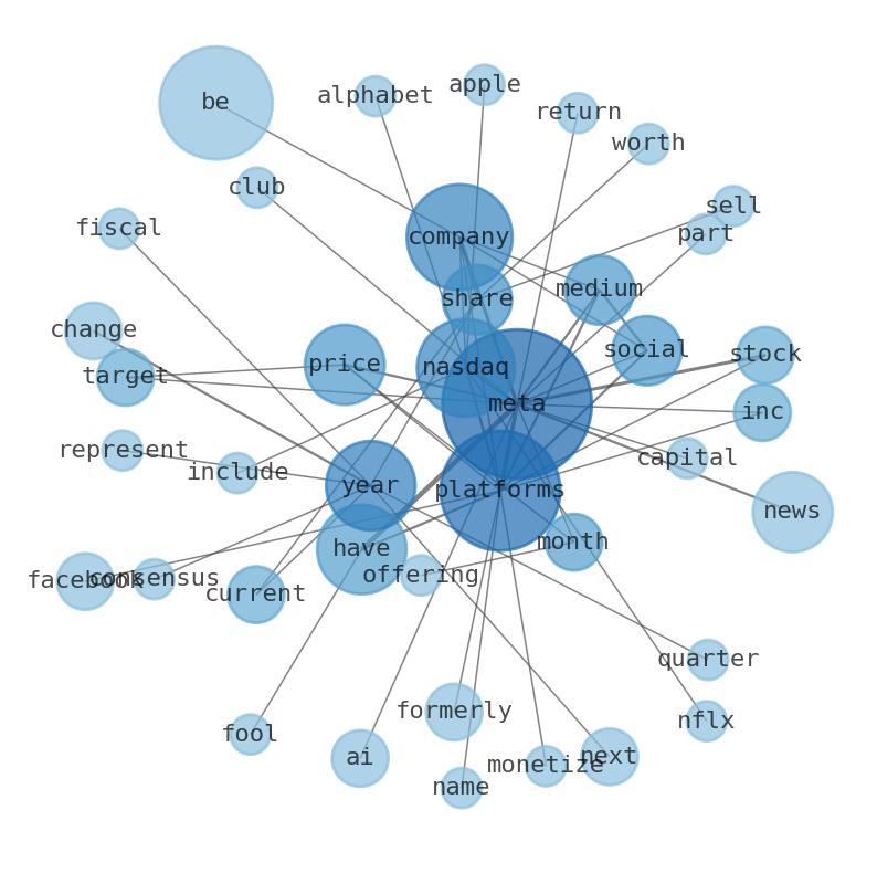 This document will help you to evaluate Meta Platforms without reading an infinite amount of sources. Relying only on stock quotes or prices to make investment decisions is a mistake. Analyzing and observing stock charts, highs and lows and other numerical data does not allow to evaluate the real value of a company. Stock quotes and prices are the result of underlying characteristics of a company and of events and news happening around them. For this reason, investing must be based on information, not numbers. As a solution, we programmed an artificial intelligence that reads the whole internet and the uses natural language processing and vectorizers to summarize the information. Usually, the AI reads several hundred pages and summarize it to a short document. This document presents our results. We found that the most common words in the internet about Meta Platforms are: Meta, company, Platforms, price, news, platform, share, …