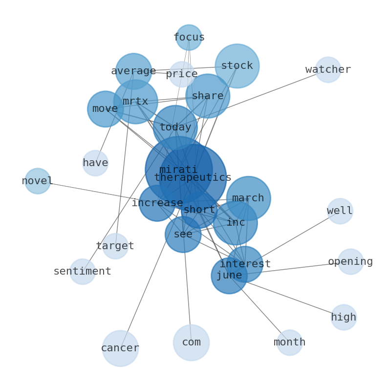 This document will help you to evaluate Mirati Therapeutics without reading an infinite amount of sources. Relying only on stock quotes or prices to make investment decisions is a mistake. Analyzing and observing stock charts, highs and lows and other numerical data does not allow to evaluate the real value of a company. Stock quotes and prices are the result of underlying characteristics of a company and of events and news happening around them. For this reason, investing must be based on information, not numbers. As a solution, we programmed an artificial intelligence that reads the whole internet and the uses natural language processing and vectorizers to summarize the information. Usually, the AI reads several hundred pages and summarize it to a short document. This document presents our results. We found that the most common words in the internet about Mirati Therapeutics are: Mirati, Therapeutics, therapeutic, stock, Inc, see, increase, …